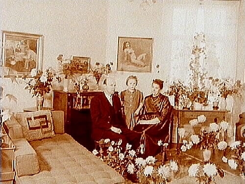 Titel: Trädgårdskonsulent Gunnar Anders 50 årsdag. Rumsinteriör. Familjegrupp tre personer.