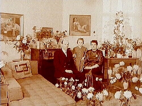 Rumsinteriör. Familjegrupp tre personer.