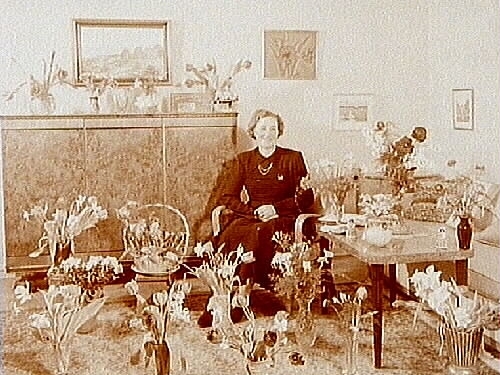 Titel: Fru Högmans 50 årsdag. Rumsinteriör, en kvinna.