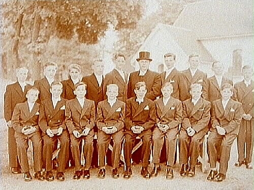 17 konfirmander, 17 pojkar med kyrkoherde Bror Strömberg (2 grupper).