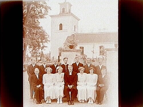 13 konfirmander, fyra flickor, nio pojkar varav en i uniform och pastor Hilding Hasselmyr.