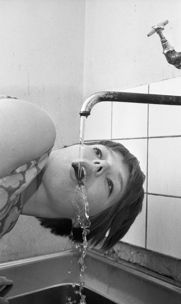 En kvinna i mönstrad ärmlös klänning är i färd med att dricka vatten ur en vattenkran.