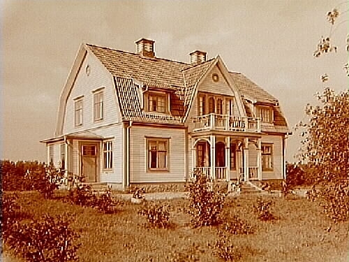 Envånings bostadshus med inredd vind, brutet tak, takhuvar och frontespis, förstuga, balkong och veranda.