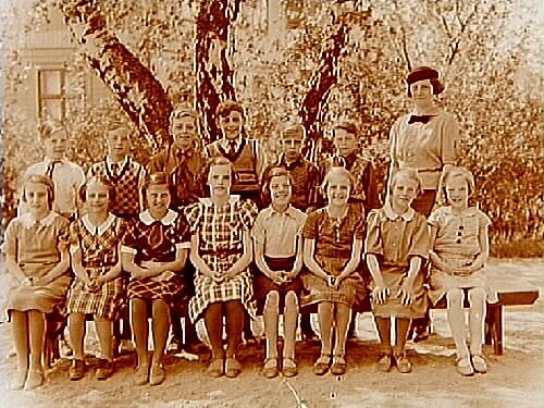 Rynninge skolan, 14 skolbarn med lärarinna fru Dahlén.