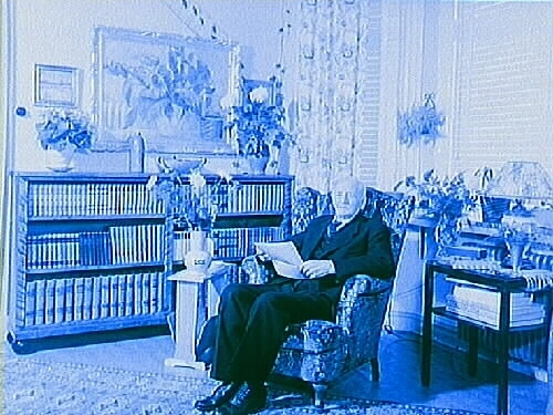 Titel: Målarmästare Edvard Lindblads 90 årsdag Rumsinteriör, en äldre man.