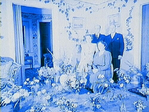 Titel: Fru David Palmroths 50 årsdag. Rumsinteriör, familjegrupp fyra personer.