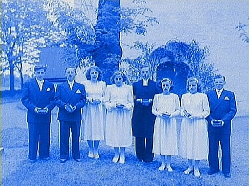 Sju konfirmander, fyra flickor, tre pojkar och kyrkoherde Bernt Bäcklund.