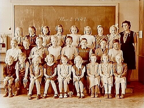 Almby Norra skola, klassrumsinteriör, 25 skolbarn med lärarinna fröken Märta Larsson, klass 2 ag, sal 3.