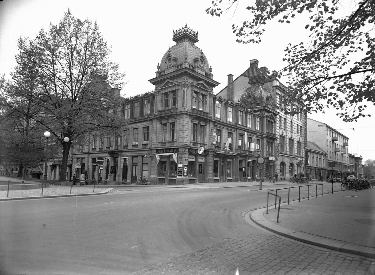 Edwalls hörna, hörnfastighet av Vasagatan och Drottninggatan, trevånings bostadshus med tre torn med tornhuvar.