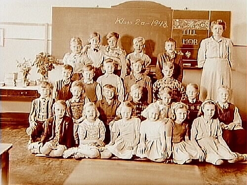 Olaus Petriskolan, klassrumsinteriör, 23 skolbarn med lärarinna fru Myrberg, klass 2A.