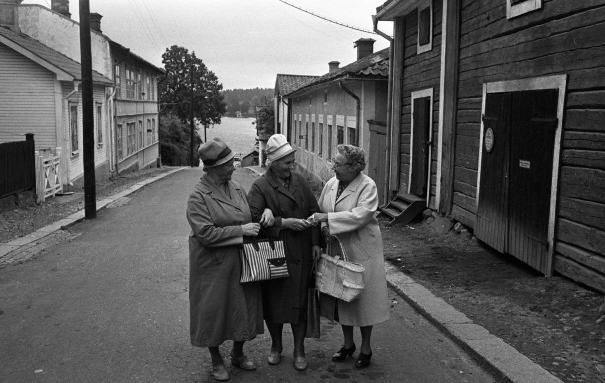 Tre äldre damer står på en gata i Nora. De är klädda i kappor, två bär hattar och alla bär handväskor i sina händer. Byggnader syns i bakgrunden.