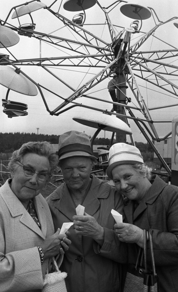 Tre äldre damer står nedanför Pariserhjulet på Noramarknaden med varsin godisstrut i händerna. Två av damerna bär hattar och alla är klädda i kappor och bär handväskor.