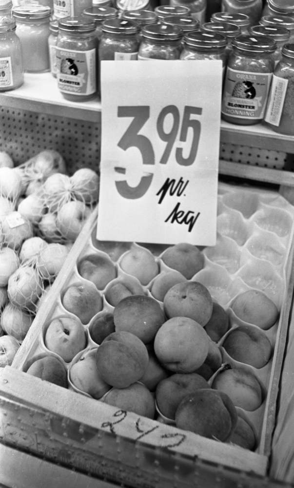 Persikor till salu ligger i en låda. Vid persikorna ligger en lapp med texten "3.95 pr. kg." Vid sidan om persikorna ligger äpplen i en annan låda. Bakom persikorna och äpplena på en hylla står burkar med honung.