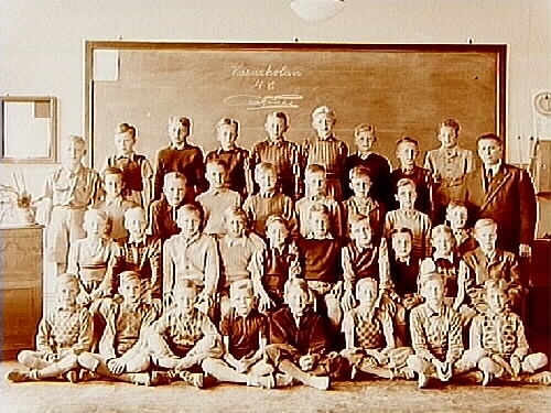 Vasaskolan, klassrumsinteriör, 35 pojkar med lärare Gustaf Tillas, klass 4C, sal 12.