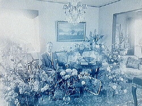 Titel: Byggmästare Arvid Eriksson på 50 årsdagen. Rumsinteriör, en man.
