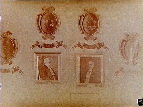 Interiör av Örbyhus Tingshus, fyra sockensköldar med följande text: Oland, Vendil, Film-Dannemora och Leufsta. Två tavlor: Carl von Bahr, 1830-1900. Gustaf Ribbing, 1900-1919.
