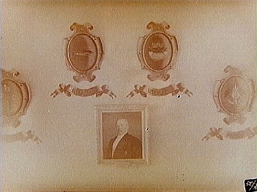 Interiör av Örbyhus Tingshus, fyra sockensköldar med följande text: Tierp, Elfkarleby, Wessland och Norunda. En tavla: Lars Erik Westblad.