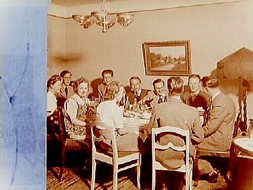 Rumsinteriör, 10 personer runt bordet, semesterfirare.