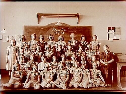 Titel: Olaus Petriskolan, klassrumsinteriör, 31 flickor med lärarinna fru Hedvig Palmblad, klass 6a, sal 12.