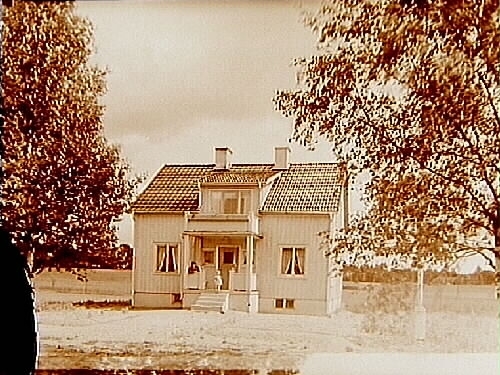 Envånings villa med inredd vind, frontespis, balkong och förstebro.