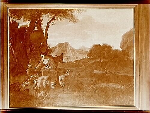 Oljemålning. Motiv: Landskap med en kvinna och en pojke, en åsna och tre får.
