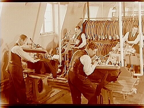 Albin Rapp Herrklädersfabrik, fabriksinteriör, fyra pressare.