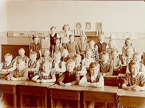 Holmens skola, klassrumsinteriör, 26 skolbarn med lärarinna fröken M. Röhlander, klass 2.