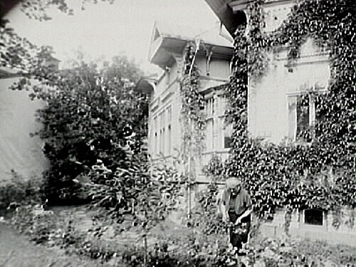 Doktorinnan Bäärnhielm i trädgården, villan i bakgrunden.