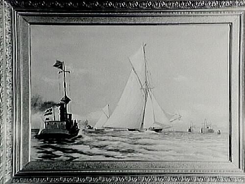 Oljemålning. Motiv: olika okända fartyg och båtar.