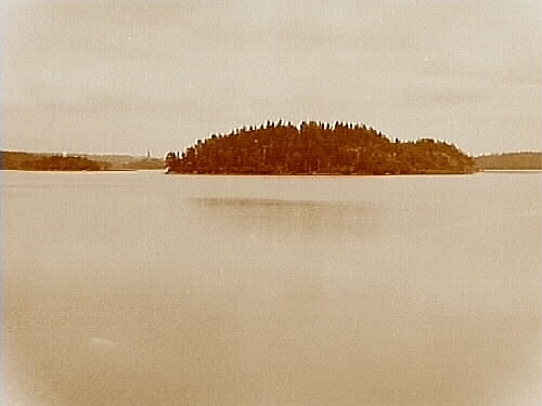 Ön Kaanan vid Ekerö kyrka vid Mälaren, från däcket på ångfartyget Örebro III.