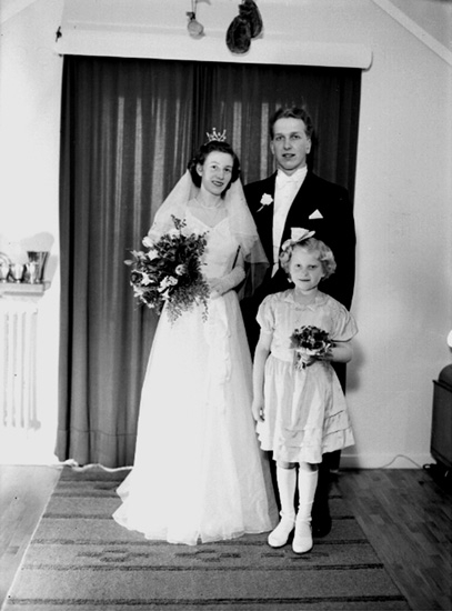 Rumsinteriör, brudpar och en liten flicka.