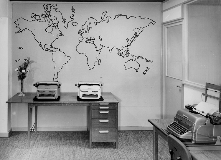 Titel: Rumsinteriör, kontorsmöbler och kontorsmaskiner. Wigrell & Co, utställning på Idrottshuset.
