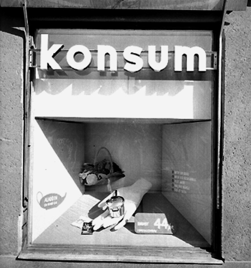 Konsum, exteriör, skyltfönster.