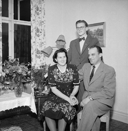 Rumsinteriör, högtid, familjegrupp tre personer.