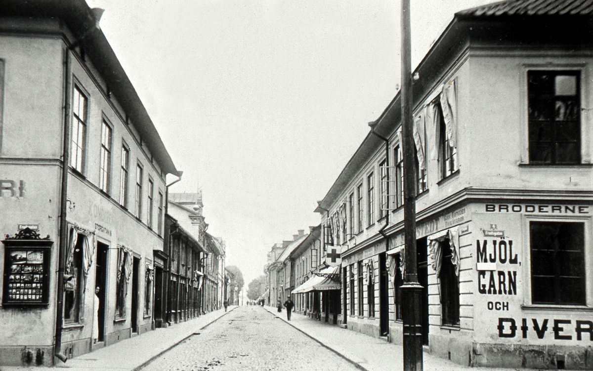 Storgatan söderut från Fredsgatan. Bröderna Sundstedts diversehandel till höger. Emil Sandgrens konditori till vänster.