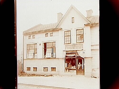 En och en halvvånings bostadshus med frontespis och affärslokal.