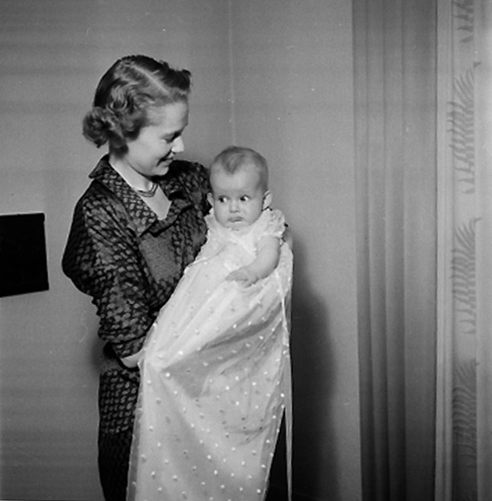 Rumsinteriör, en kvinna och en baby, barndop.