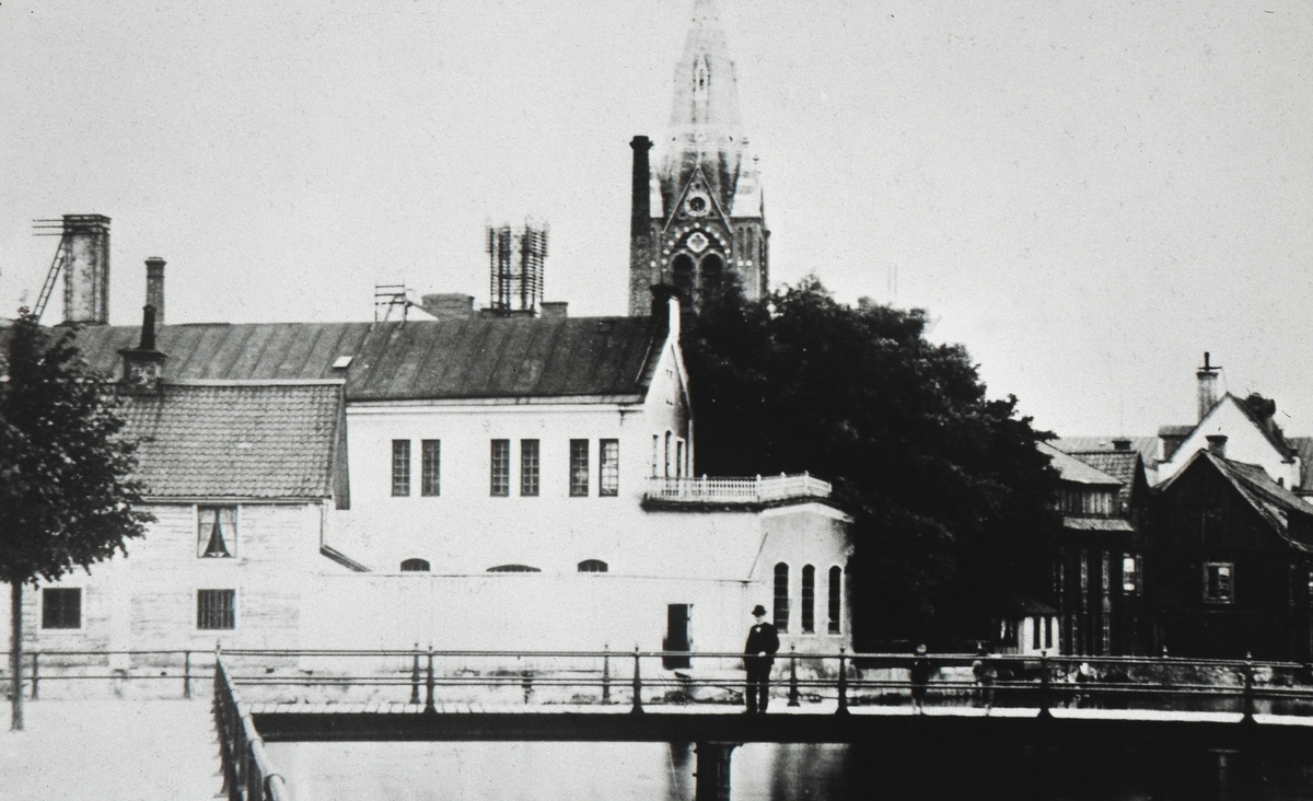 På bilden ser man en man och två barn som står på bron till Frimurarlogen.