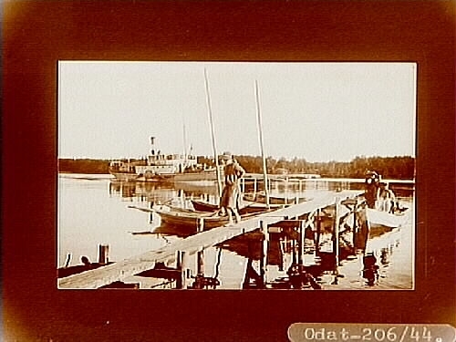 En brygga vid älven, en flicka på bryggan, en roddbåt med fyra personer i, en hjulångare ute på älven.