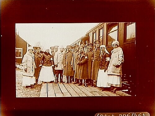 Sjuktransport av krigsfångar, ryska soldater, sjuksystrar vid en station.