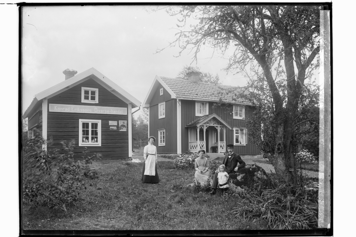 Tvåvånings enkelstuga med veranda med snickarglädje. Flygelbyggnad innehållande lanthandel, 4 personer framför byggnaden.