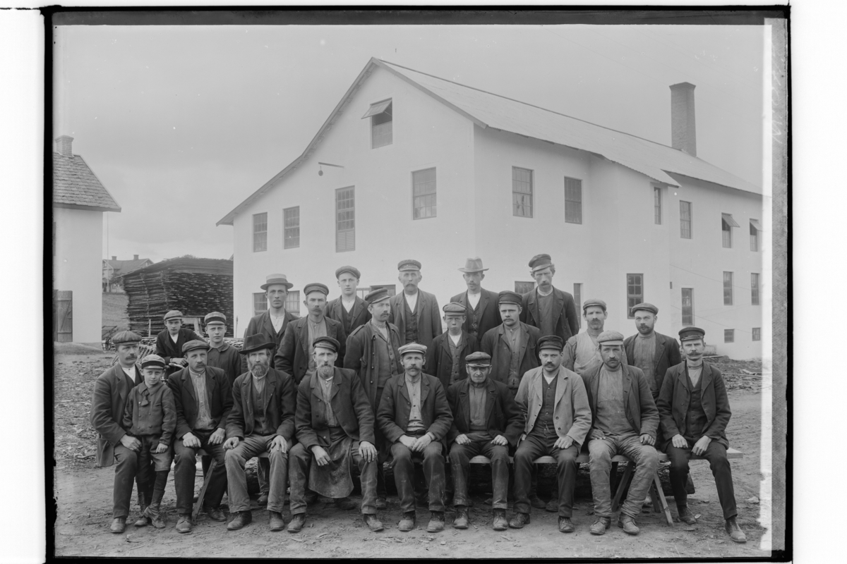 Sågverk, fabriksbyggnad, 22 sågverksarbetare och en pojke.