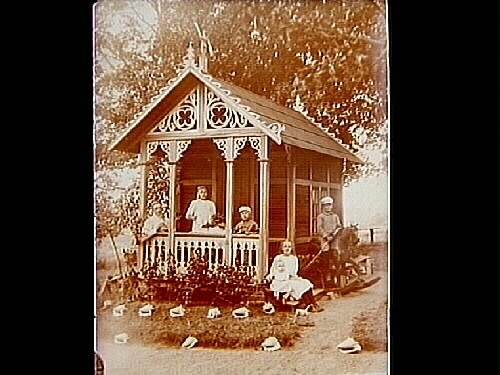 Titel: Lekstuga med snickarglädje. Familjegrupp, 6 personer, varav en pojke på gunghäst. Fru Maria Karlsson