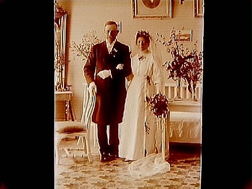 Brudpar, bruden helt i vitt, brudgummen i frack.