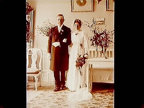 Brudpar, bruden helt i vitt, brudgummen i frack.