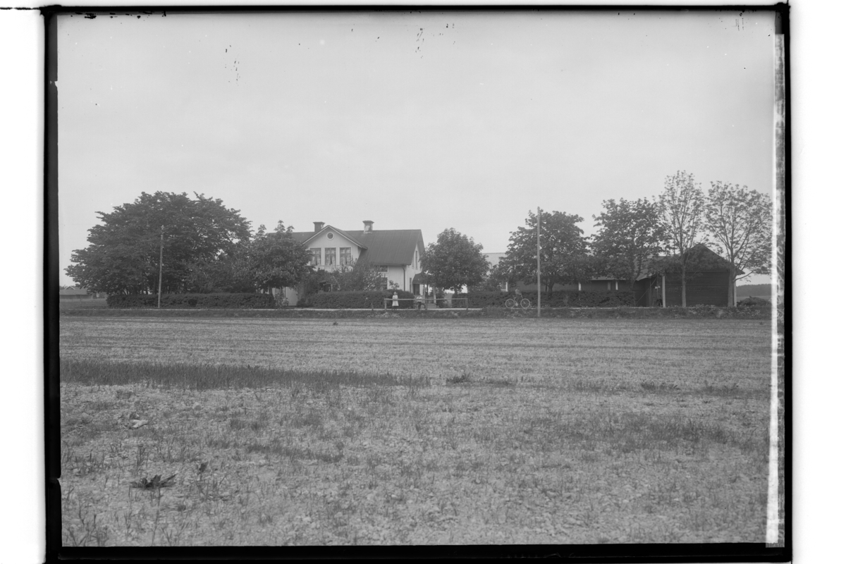 En och en halvplans bostadshus med frontespis. Ett uthus till höger.
