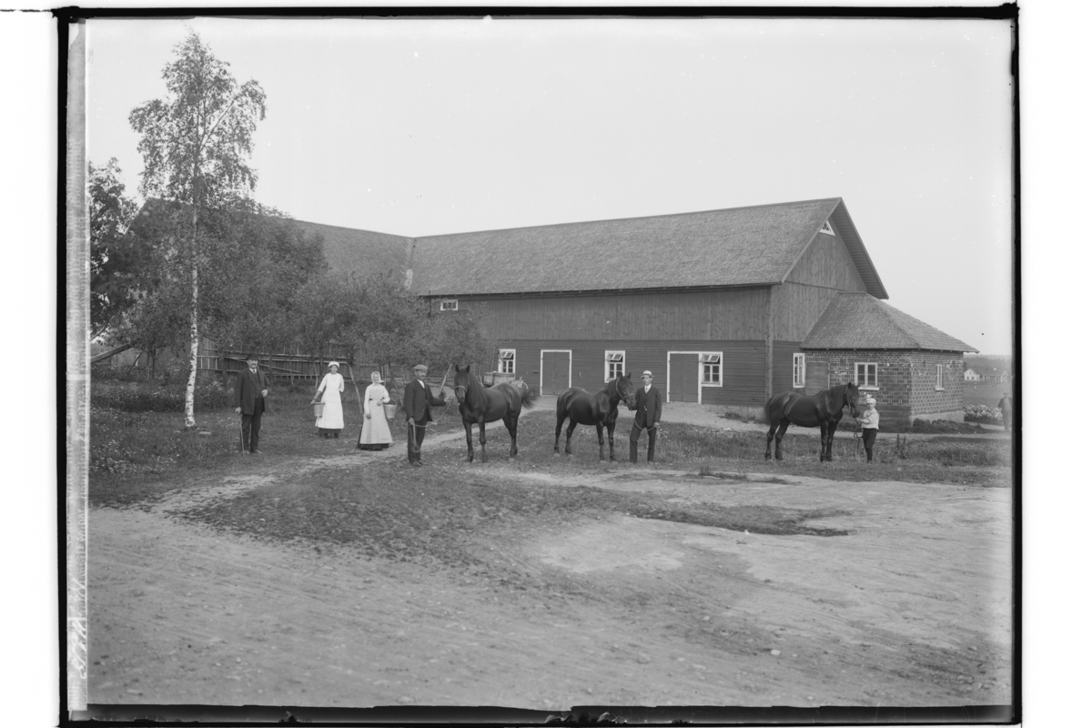 Ladugårdsbyggnad, 3 hästar, 6 personer.