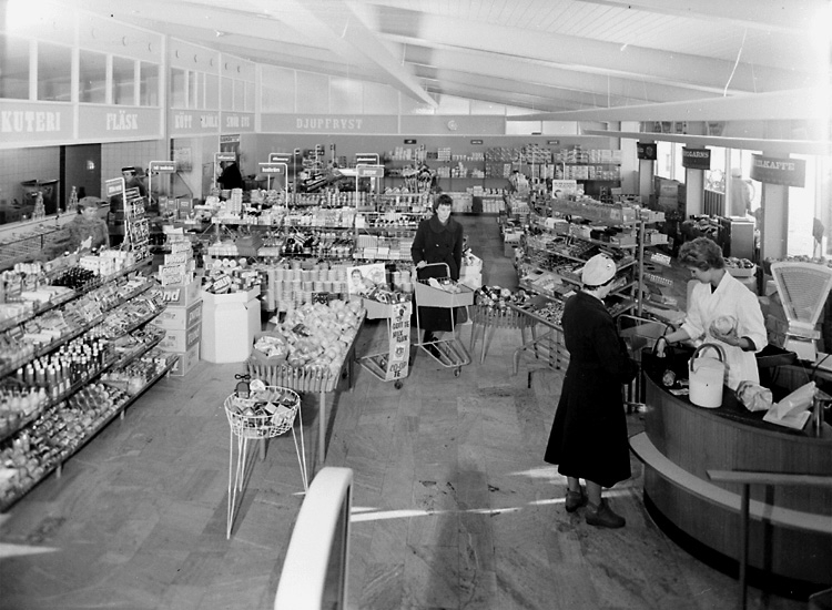 Konsum, affärsinteriör med kunder och personal.