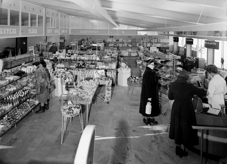 Konsum, affärsinteriör med kunder och personal.