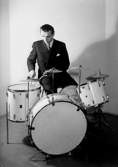 En man med musikinstrument (trummor).